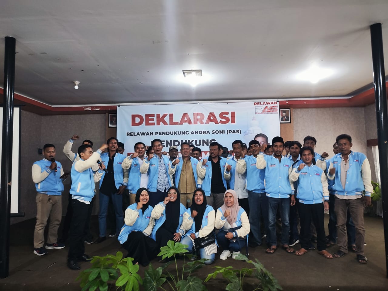 Terbaru, dukungan muncul dari puluhan anak muda atas nama relawan Pendukung Andra Soni (PAS) yang berasal dari Kabupaten Serang. Deklarasi tersebut dilakukan di rumah makan Sari Banten, Kota Serang, Rabu (29/5/2024). Hadir dalam acara tersebut Ketua Badan Pemenangan Pemilu (Bappilu) DPD Gerindra Banten Oong Syahroni.