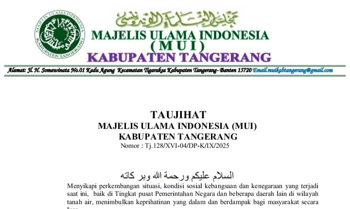 Berdasarkan Surat Taujihat MUI Kabupaten Tangerang, Nomor: Tj.128/XVI-04/DP-K/IX/2025 yang diterima bantenekspres.co.id dari MUI setempat, bahwa MUI Kabupaten Tangerang menyerukan untuk melakukan langkah-langkah berikut.