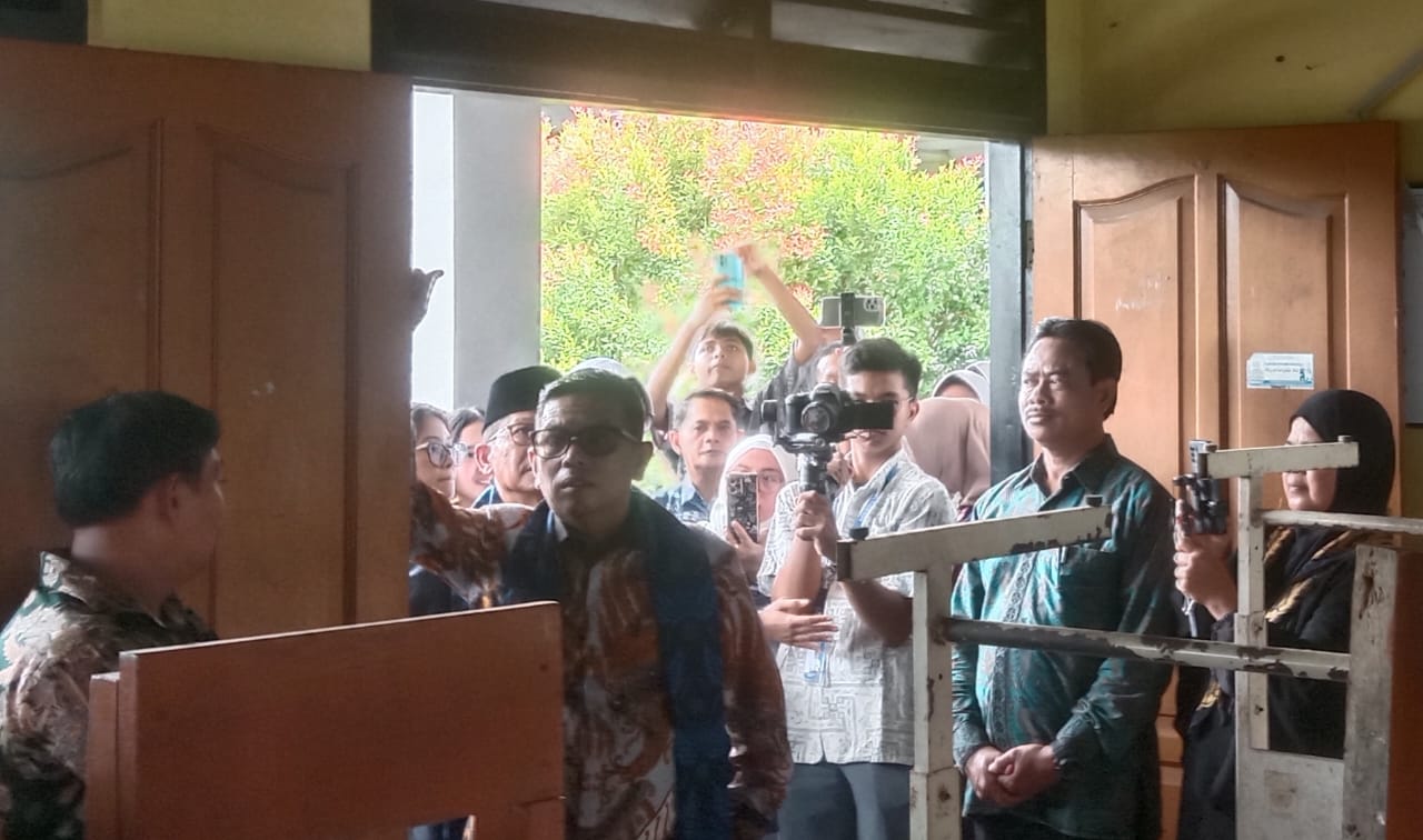 Andra Soni didampingi Wali kota Tangerang, Sachrudin dan Wakilnya, Maryono dan jajaran Dinas Pendidikan meninjau ruangan yang atapnya ambrol.