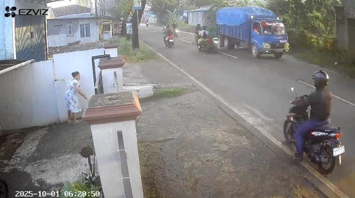 Pada rekaman cctv yang diterima bantenekspres.co.id, nampak, pengendara sepeda motor dari arah berlawana tanpa mengenakan helm bersenggolan dengan korban. Sebelum akhirnya terjatuh dan terlindas ban belakang truk.