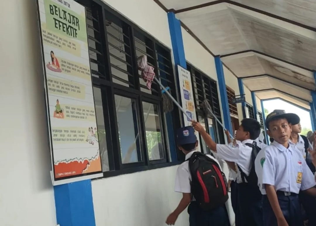 Para siswa mulai dari kelas 7 sampai kelas 9 bahu membahu bersama membersihkan lingkungan sekolah, mereka dengan suka cita dan semangat membersihkan semua sudut sekolah tanpa terkecuali. Hal tersebut, sudah menjadi kebiasaan mereka yang dilakukan sebulan sekali dalam melakukan aksi gotong royong bersama.