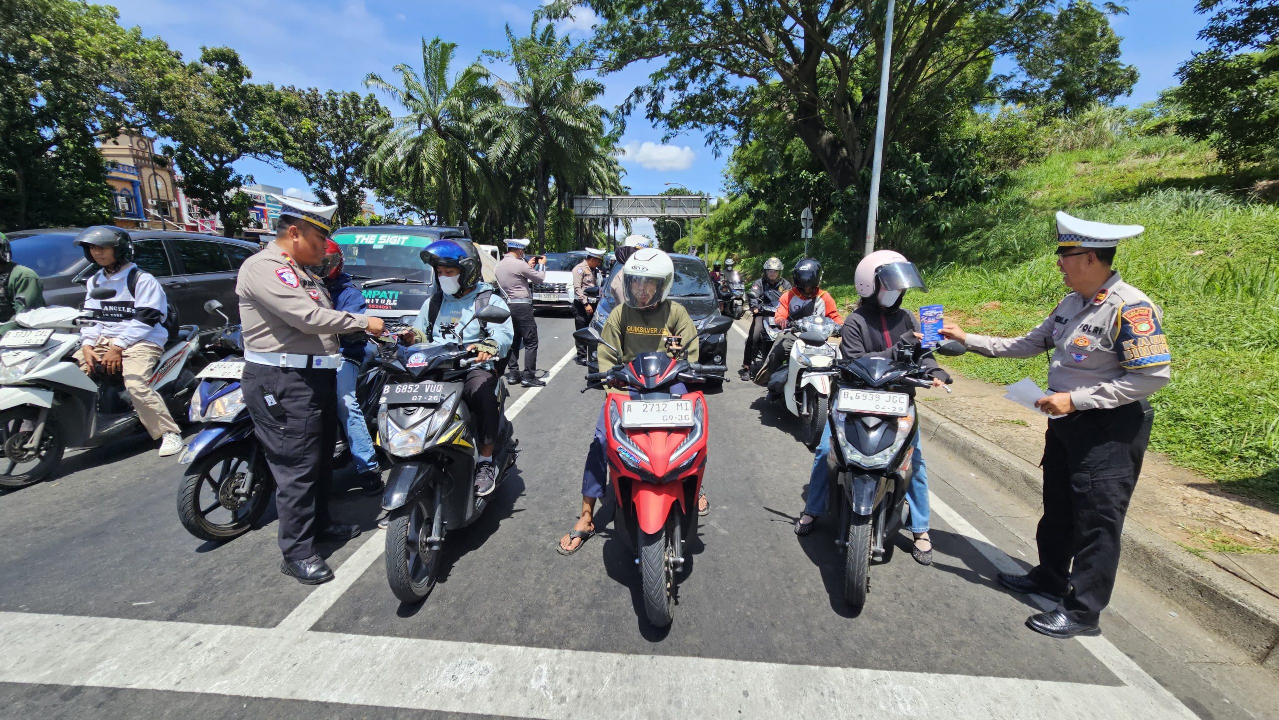 lalu lintas dengan metode penindakan berupa teguran hingga pemberian sanksi tilang. Beberapa pelanggaran yang menjadi fokus penindakan antara lain pengendara yang tidak menggunakan helm, tidak memasang Tanda Nomor Kendaraan Bermotor (TNKB), hingga penggunaan plat nomor palsu atau tidak sesuai aslinya yang belakangan marak di jalan,” ujarnya.