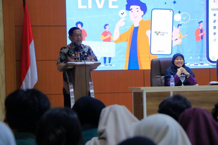 Sekretaris Daerah Kota Tangerang, H. Herman Suwarman menjelaskan pentingnya mahasiswa untuk aktif menggunakan Tangerang LIVE sebagai platform digital yang terintegrasi dengan berbagai layanan masyarakat.