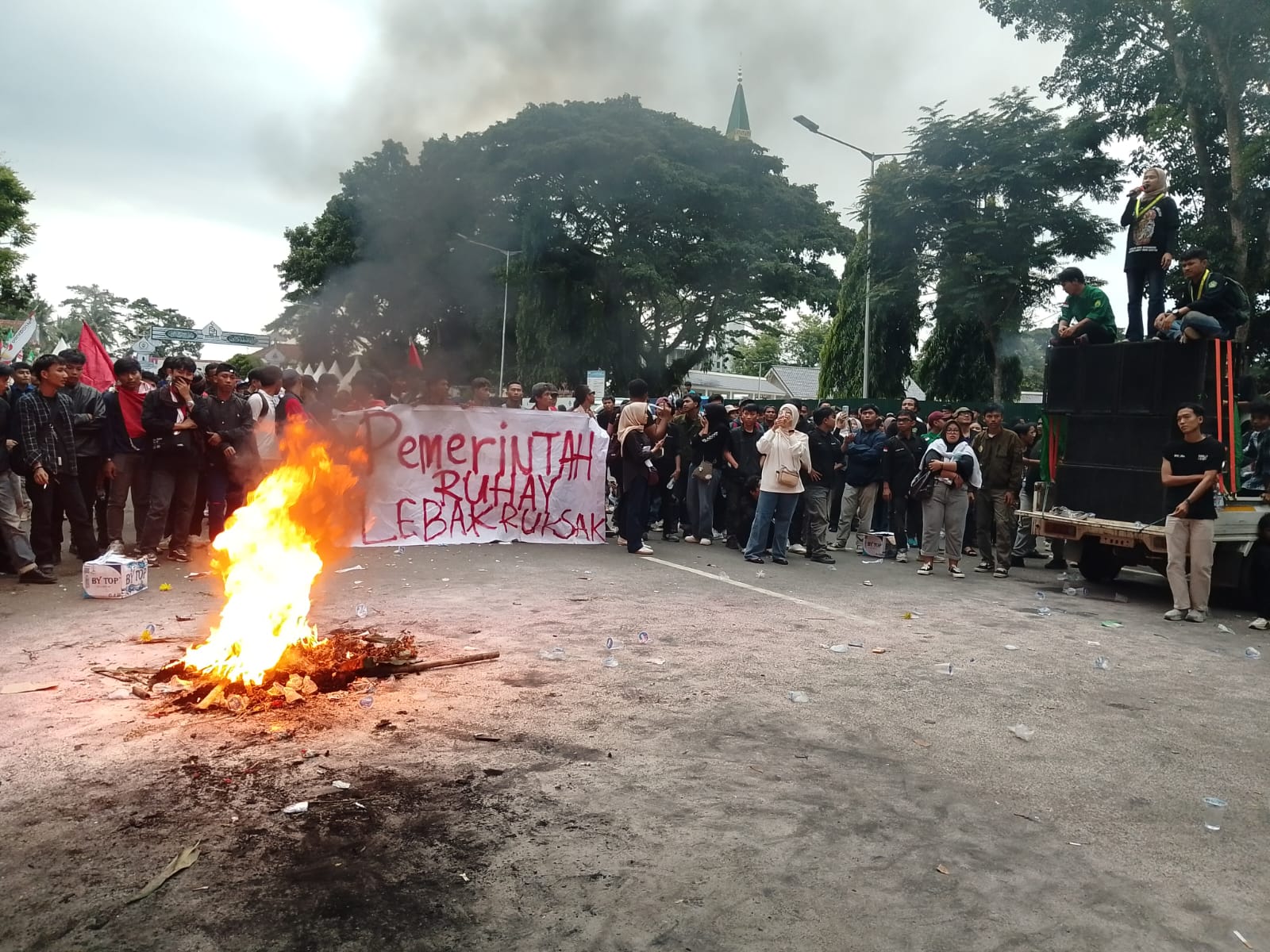 “Lebak hari ini genap berusia 197 tahun, tetapi apa yang benar-benar kita rayakan. Apakah jalan yang rusak di hampir semua kecamatan?, apakah ibu hamil yang harus menunggu ambulans yang tak pernah tiba? menunggu ?, atau anak-anak yang putus sekolah karena ruang kelas tak layak dan guru tak tersedia ?,” kata Sapnudi, koordinator aksi, saat orasi.