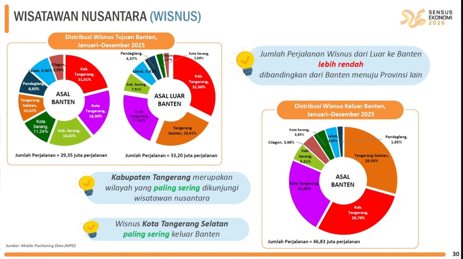 Ia menjelaskan, wisatawan nusantara yang berasal dari Kota Tangerang Selatan merupakan wisatawan yang paling sering menuju provinsi lain di 2025. Total jumlah perjalanan wisatawan nusantara dari Kota Tangerang Selatan menuju provinsi lain mencapai 13,74 juta perjalanan.