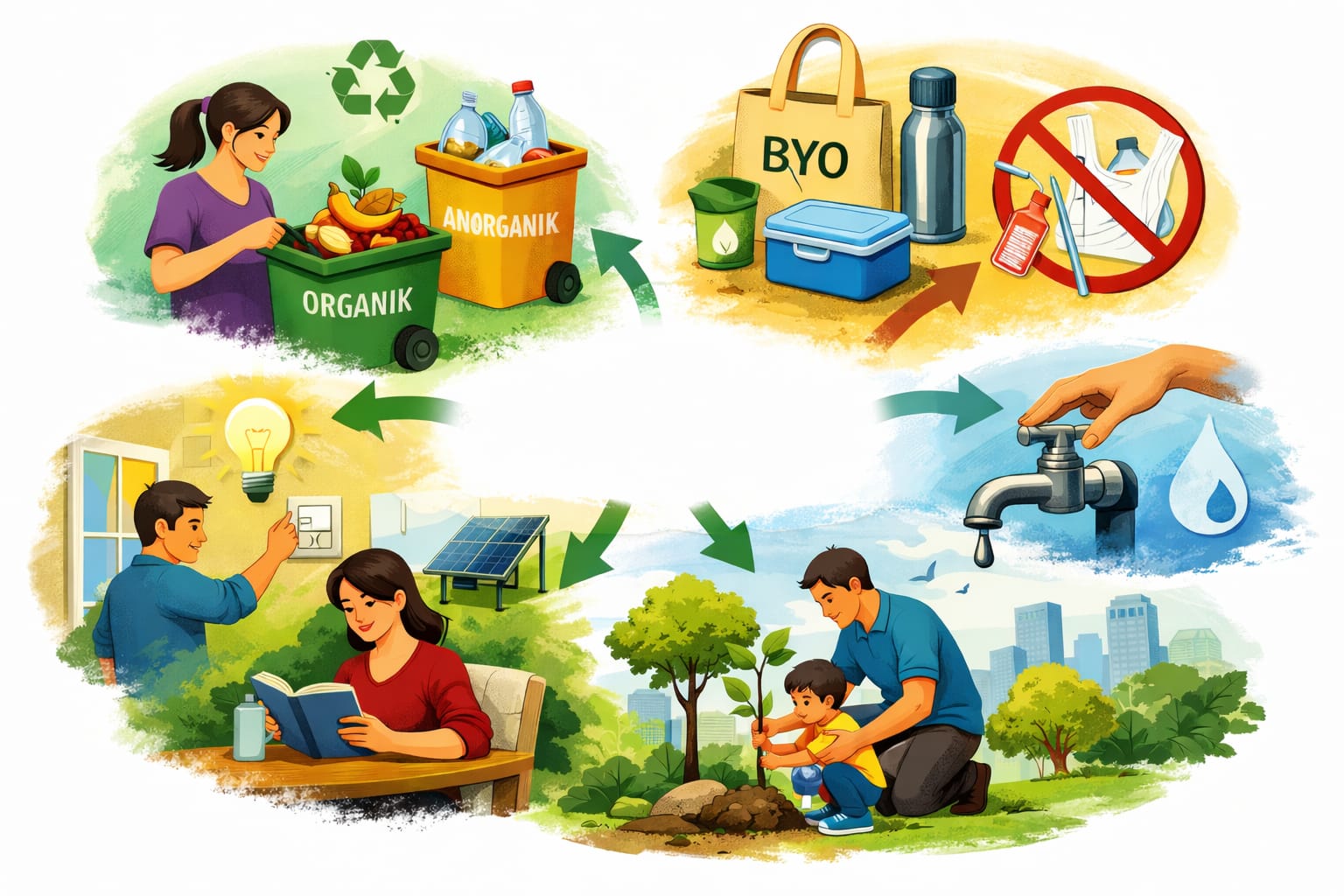 Kelima kiat tersebut tidak berdiri sendiri, melainkan saling berkaitan. Pengelolaan sampah, pengurangan plastik, penghematan energi, penggunaan air yang bijak, dan perawatan ruang hijau membentuk pola hidup yang lebih ramah lingkungan jika dilakukan secara bersama sama.